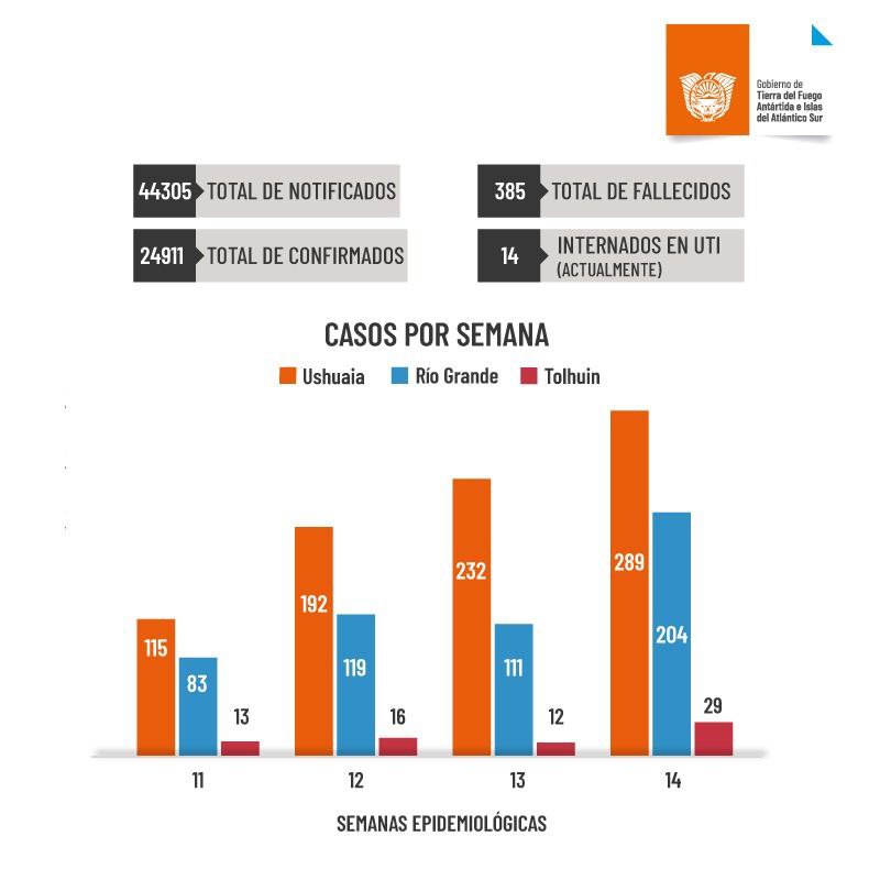 En la última semana se detectaron 289 casos nuevos en Ushuaia, 204 en Río Grande y 29 en Tolhuin. Al día de la fecha hay 14 pacientes internados en UTI en toda la Provincia, con una ocupación del 17% de camas de terapia intensiva. El número de altas desde el inicio de la pandemia asciende a 23907. Hay a la fecha 619 casos activos en Tierra del Fuego.