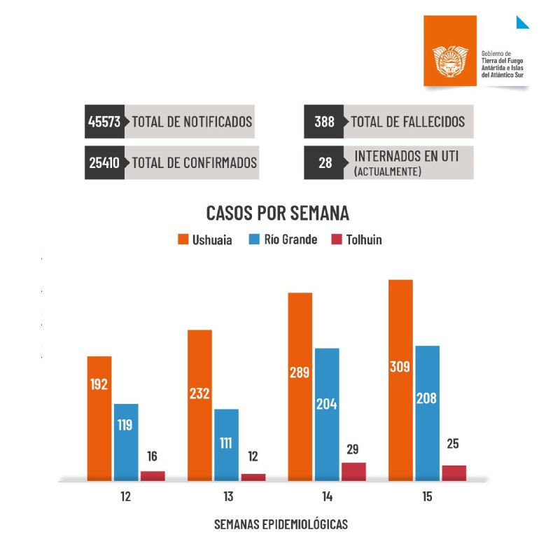 En la última semana se detectaron 309 casos nuevos en Ushuaia, 208 en Río Grande y 25 en Tolhuin. Al día de la fecha hay 28 pacientes internados en UTI en toda la Provincia. El número de altas desde el inicio de la pandemia asciende a 24480. Hay a la fecha 542 casos activos en Tierra del Fuego.