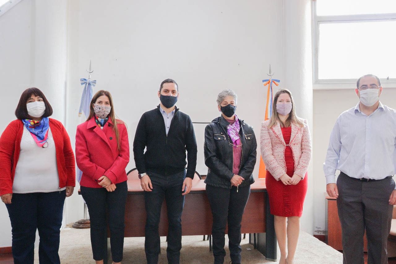 El presidente de la Caja de Previsión Social, Leonardo Gómez junto al vicepresidente Juan Pablo Quinteros y las vocales Patricia Blanco y Norma González recibieron a la Secretaria de Justicia de la provincia Daiana Freiberger.