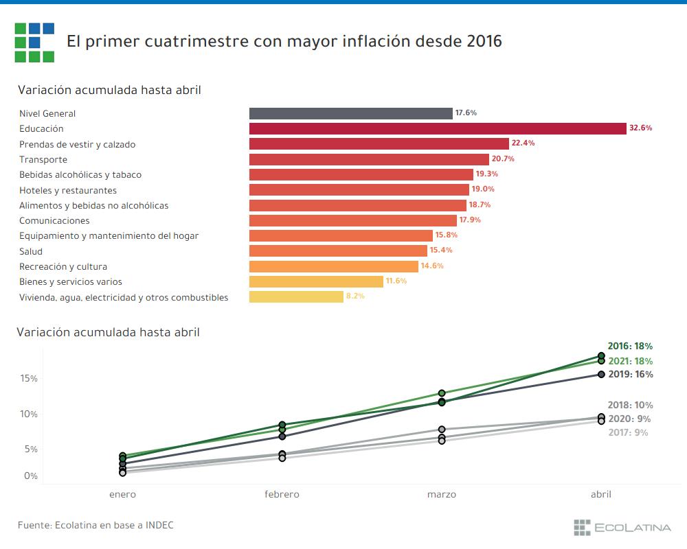 El nivel general no es lo único preocupante. Por caso, el rubro alimentos y bebidas, principal consumo de los sectores de menores recursos, siguió subiendo más rápido que el promedio. En abril, este capítulo avanzó 4,3%, acumulando 18,7% en los primeros cuatro meses del año. En tanto, educación saltó 32,6% entre enero y abril, seguido de prendas de vestir y calzado (+22,4%) y transporte (+20,7%). Por el contrario, vivienda y electricidad subió menos de 9%, producto del congelamiento tarifario -levemente actualizado en mayo-, a la par que equipamiento y mantenimiento del hogar avanzó 15,8% entre enero y abril, en un contexto de dólar oficial y paralelo calmo.