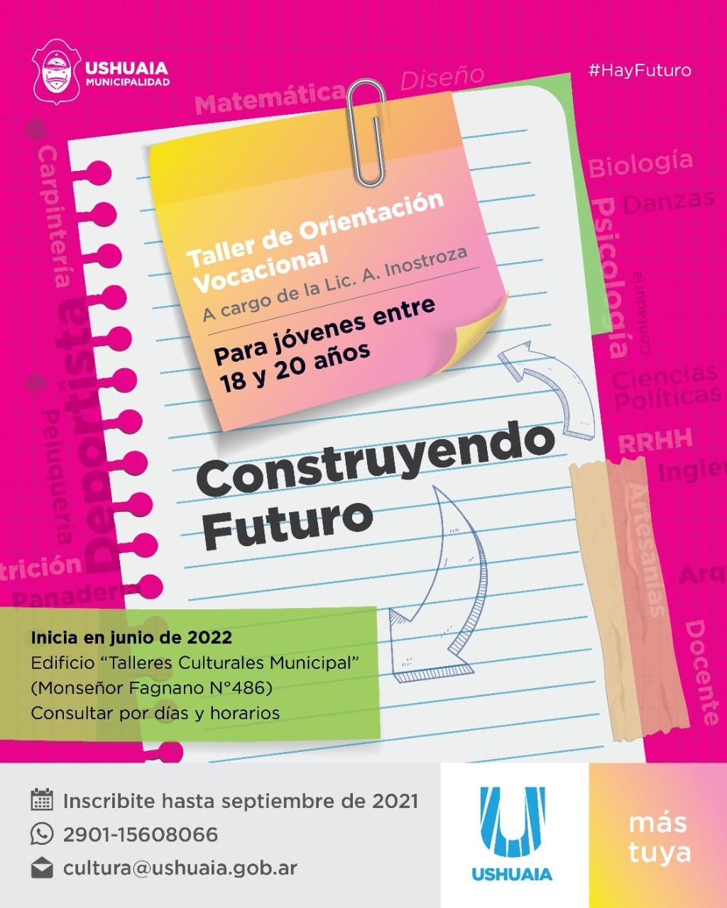 Ushuaia 27/05/2021.- La Municipalidad de Ushuaia, a través de la Secretaría de Cultura y Educación informa el lanzamiento de los Talleres de Orientación Vocacional “Construyendo Futuro” a cargo de la Lic. Ayelen Inostroza, destinado a jóvenes entre 18 y 20 años.
