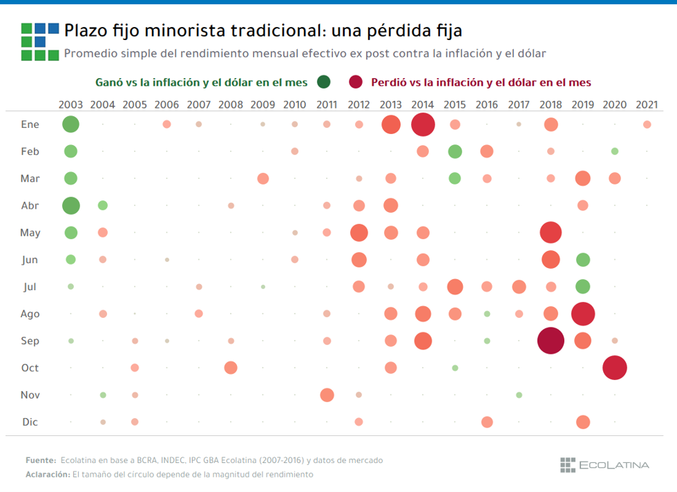 En los últimos largos años, ahorrar en pesos no fue una buena decisión, en tanto la tasa de interés de plazos fijos estuvo sistemáticamente por debajo de la inflación y, no menor, de la devaluación en el mediano plazo. En números, en los 220 meses que van desde enero de 2003 a abril de 2021, tan sólo en 20 la tasa de interés en pesos le ganó a la inflación mensual y a la tasa de devaluación mensual. Por el contrario, en 200 perdió contra una de estas variables al menos. En consecuencia, el peso no fue un buen activo financiero, es decir, buena reserva de valor, y de ahí la bimonetarización de la economía, que ya existía de antes, pero se reforzó en la última década.