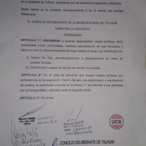 En este sentido, el proyecto detalla que “pedimos que se sancione una ordenanza impidiendo a quienes desempeñan cargos políticos, tanto municipales como provinciales, mientras permanezcan en sus funciones y hasta los dos años posteriores de haber dejado el cargo, ser beneficiario de canon de uso, pre-adjudicaciones o adjudicaciones en venta de predios fiscales, donaciones o pagos de deuda con tierras municipales”.