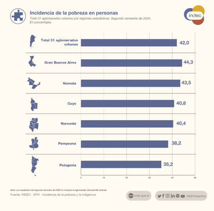 Por la crisis económica y social provocada por la pandemia, la aceleración de la inflación -en particular del precio de los alimentos-, mayor desempleo y una abrupta recesión que lleva tres años en el país, la pobreza alcanzó al 42% de los argentinos, de acuerdo al número del segundo semestre de 2020 que publicó el Indec. Las personas bajo la línea de pobreza ya son 19 millones, lo que representa un aumento del 6.5% en el último año. A nivel nacional, la cantidad de personas bajo la línea de indigencia es de 4.7 millones por lo que ascendió a 10.5% y creció un 2.5% en comparación al año pasado.