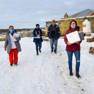 Durante los recorridos, personal de la Municipalidad de Ushuaia colabora con el retiro de la nieve de los accesos a los hogares de los adultos mayores. Asimismo, el trabajo se articula con la Municipalidad de Tolhuin, para llegar a los vecinos y vecinas de dicha localidad.