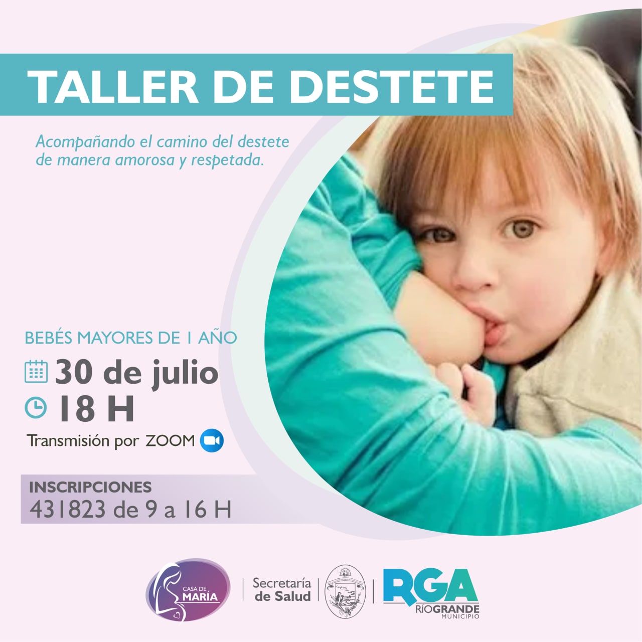 Finalmente, el viernes 30 de julio, a las 18 horas, se llevará a cabo el taller virtual «Destete»: acompañando el camino del destete de manera amorosa y respetada. Cabe destacar que el mismo está orientado a familias con bebés mayores a 1 año de edad. Cabe destacar que los talleres son abiertos a la comunidad, y que quienes deseen participar de alguna de las propuestas deben inscribirse previamente comunicándose telefónicamente al 431823, de 9 a 16 horas.