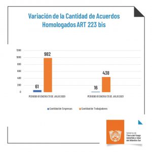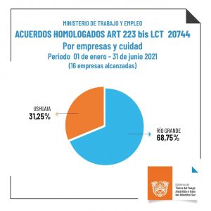 El 69% de empresas que se acogieron a este beneficio corresponden a Río Grande y el 31% a Ushuaia, alcanzando a un total a 438 trabajadores; de los cuales el 73% pertenecen a la ciudad norte y el 27% a la ciudad capital de la provincia. En comparación al primer semestre del 2020, la cantidad de acuerdos homologados alcanzaban a un total de 61 empresas.