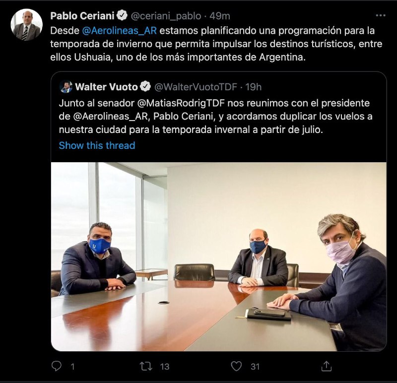 Ushuaia 02/07/2021.- El presidente de Aerolíneas Argentinas, Pablo Ceriani, destacó el trabajo impulsado junto a la Municipalidad de Ushuaia para aumentar la frecuencia semanal de vuelos. En su cuenta de Twitter, el presidente de Aerolíneas Argentinas expresó que “estamos planificando una programación para la temporada de invierno que permita impulsar los destinos turísticos”.