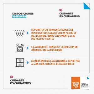 Los alcances de la aplicación de las medidas dispuestas son de acuerdo al Decreto de Necesidad y Urgencia N ° 455/21 y rigen desde este sábado 11 de julio hasta el 06 de agosto de 2021. Asimismo se recuerda e insta a la comunidad a continuar cumpliendo con los protocolos vigentes como así también con las medidas sanitarias: mantener distanciamiento social; uso de tapaboca; ventilar los espacios cerrados y lavado frecuente de manos.