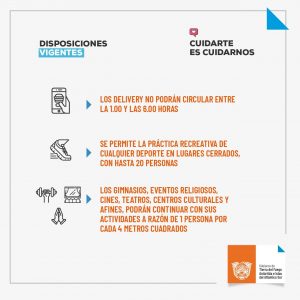 Los delivery no podrán circular entre la 1 y las 6 horas de la mañana. Se permite la práctica recreativa de cualquier deporte en lugares cerrados, con hasta 20 personas, manteniendo el distanciamiento mínimo de metros entre los y los participantes. Las competencias deportivas nacionales, regionales y provinciales, en lugares cerrados o abiertos podrán desarrollarse siempre y cuando cuenten con protocolos aprobados.