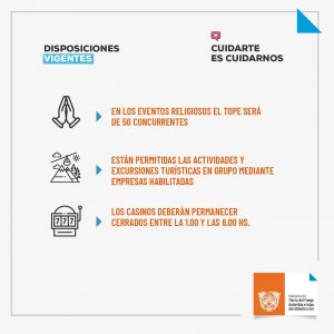 Los casinos deberán permanecer cerrados entre la 1 y las 6 horas de la mañana. Continúan suspendidas las actividades de bingos y discotecas. Los actos escolares por motivos de celebraciones nacionales o provinciales podrán realizar previa aprobación del protocolo que deberán remitir acoetdf@gmail.com .
