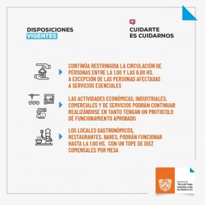 Se amplía la actividad de quinchos y salones con un máximo de hasta 30 personas. Continúa restringida la circulación de personas entre la 1 y las 6 de la mañana, una excepción de las personas afectadas a servicios esenciales. Las actividades económicas, industriales, comerciales y de servicios continuarán realizándose en tanto tengan un protocolo de funcionamiento aprobado. Los locales gastronómicos, restaurantes, bares, podrán funcionar hasta la 1 de la mañana con un tope de diez comensales por mesa.