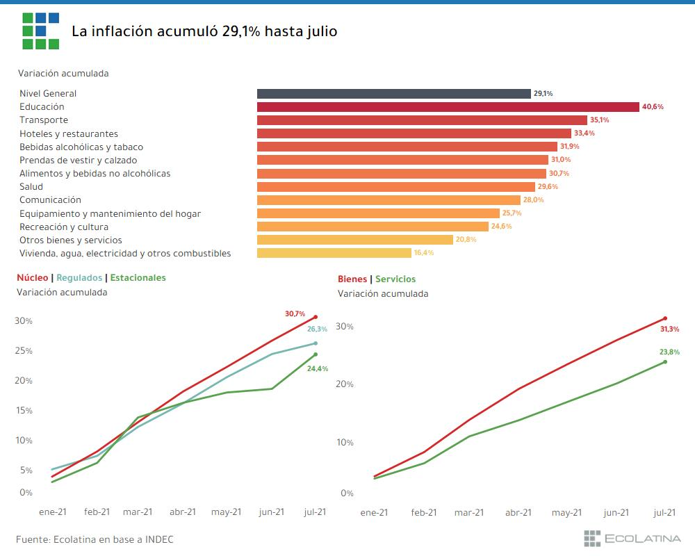 Argentina 12/08/2021.- En julio, la inflación nacional fue de 3% según informó el INDEC. De este modo, se registró la variación más baja desde septiembre del año pasado, cuando había comenzado a acelerar impulsada por la flexibilización de la cuarentena. En sentido inverso, la suba de precios acumuló 51,8% en los últimos doce meses, alcanzando el mayor valor desde enero de 2020.
