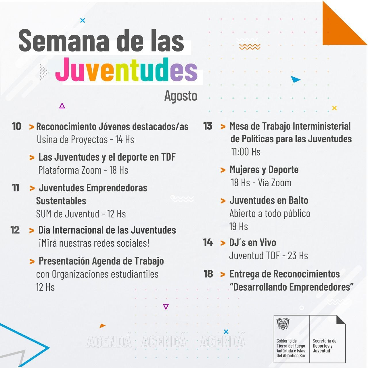 Se les reconocerán los logros realizados, además de ofrecerles un espacio para la recreación y sociabilización. El cronograma inicia este martes 10 de agosto con una entrega de reconocimientos a jóvenes destacadas y destacados de la ciudad de Ushuaia. También se llevará adelante un encuentro virtual vía Zoom denominado “Las Juventudes y el Deporte en TDF” junto a Casa Tierra del Fuego.