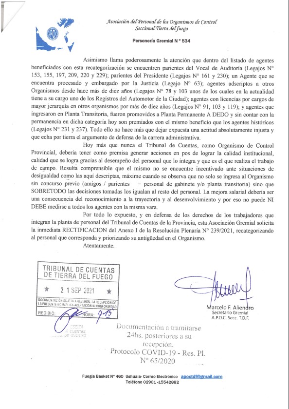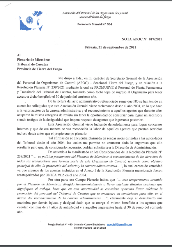Ushuaia 22/09/2021.- La Asociación del Personal de Organismos de Control, (APOC) envió una nota al Tribunal de Cuentas para que rectifique de manera inmediata el texto de la resolución plenaria 239/2021 recategorizando al personal que corresponda y priorizando su antigüedad en el organismo. Texto original de la nota.