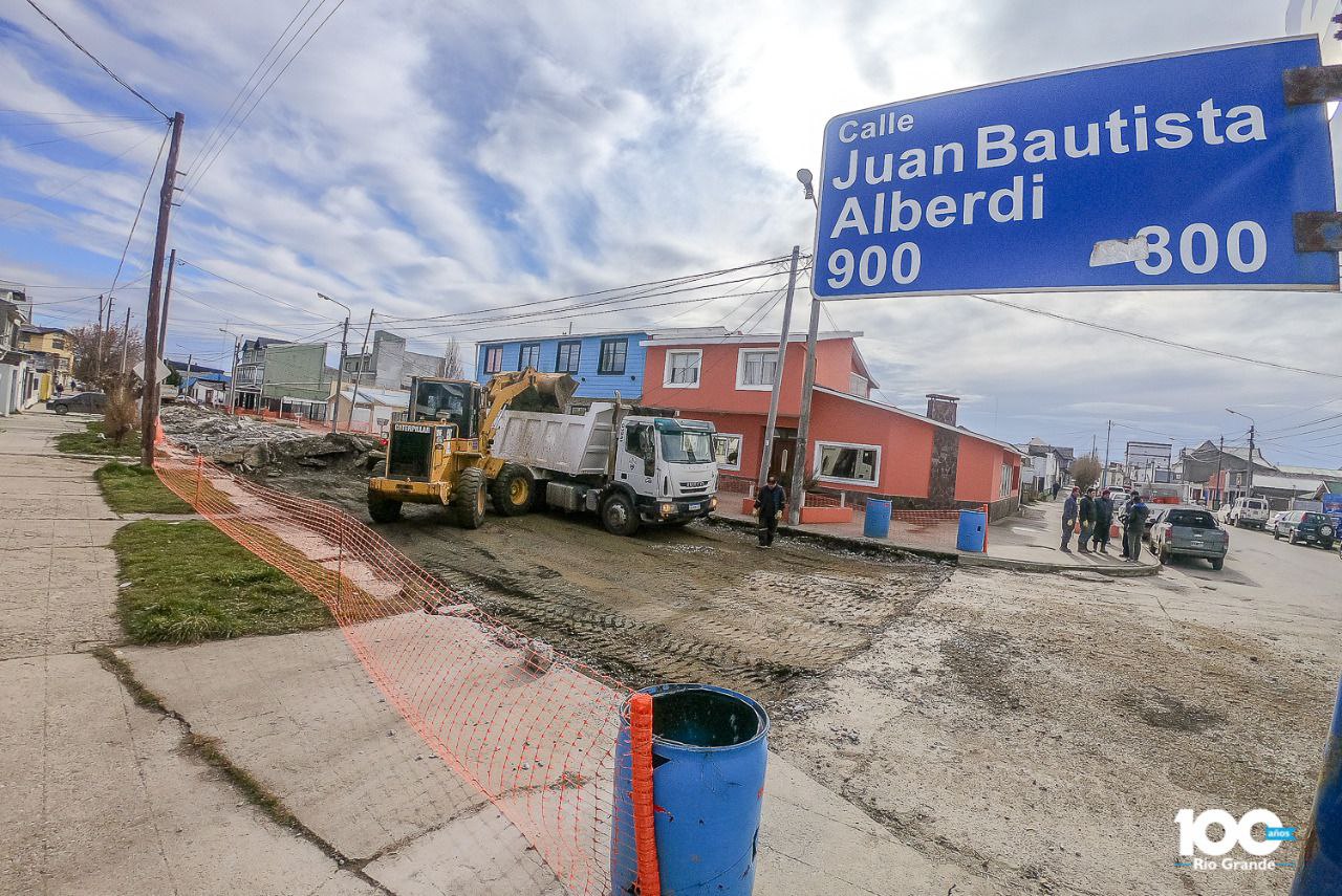 Rio Grande 14/09/2021.- Se trata de una obra que el Municipio de Río Grande lleva adelante por administración y con personal de la Dirección de Obras Viales. El Plan de trabajo para la siguiente temporada comprende tareas de bacheo en toda la ciudad. En este sector de calle Alberdi, se harán las pendientes adecuadas para el buen escurrimiento de las aguas.