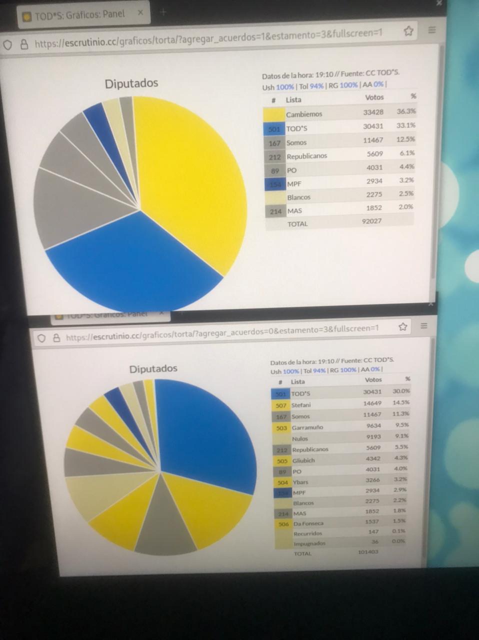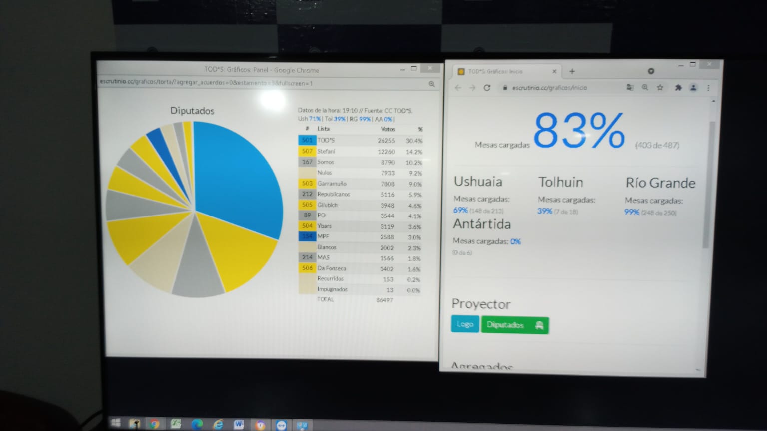 Rio Grande 12/09/2021.- Con el 83% de las mesas escrutadas Tierra del Fuego decidió a través de las urnas y habrá un cambio por los resultados que se ven hasta ahora, Chispita Fadul es una de las Sorpresas, Carolina Yutrovik ingresaría a la Camara de Diputados en segundo lugar y en primer lugar el actual diputado de JxC, Tito Stefani. Datos finales y oficiales