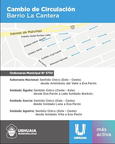 Ushuaia 02/09/2021.- La Municipalidad de Ushuaia comunica a vecinos y vecinas de la ciudad que, a partir del próximo martes 7 de septiembre entrará en vigencia la Ordenanza Municipal N°5730 y cambiarán el sentido de circulación las calles Soberanía Nacional, Soldado Águila, Soldado García y Soldado Aguirre en el barrio La Cantera.