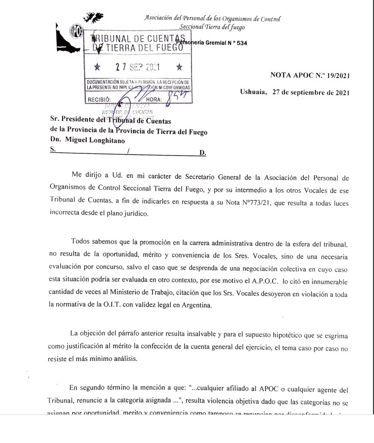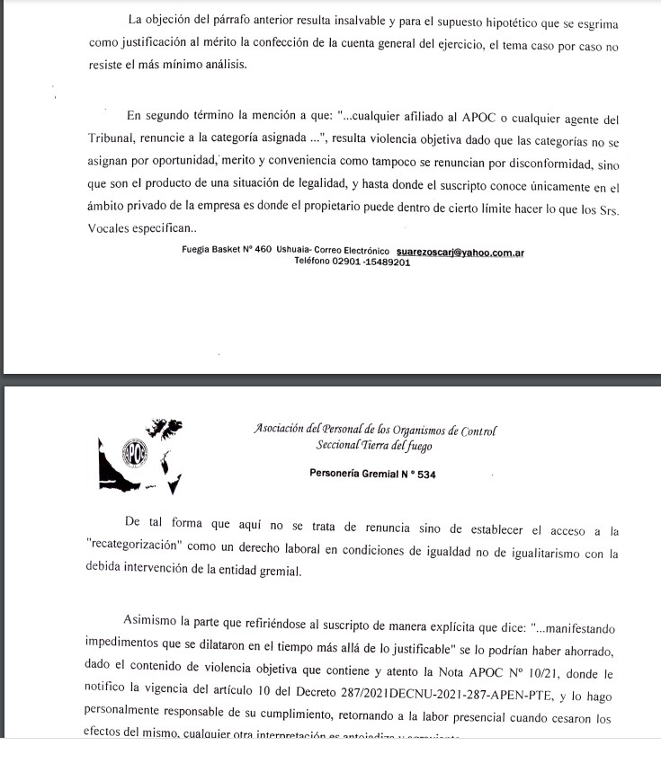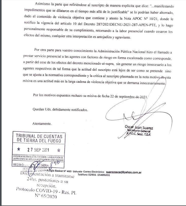 Ushuaia 28/09/2021.- El secretario general de APOC, Oscar Juan Suarez respondió la nota enviada por el Tribunal de Cuentas donde se les informaba que si no estaban de acuerdo con las categorías que renunciaran, ratificó la resolución 239/2021 y dio por finalizado el dialogo con el gremio. Al respecto Suarez califica la actitud de los vocales como violencia objetiva que se derrama innecesariamente. Todo esto ya tiene características de escandalo.