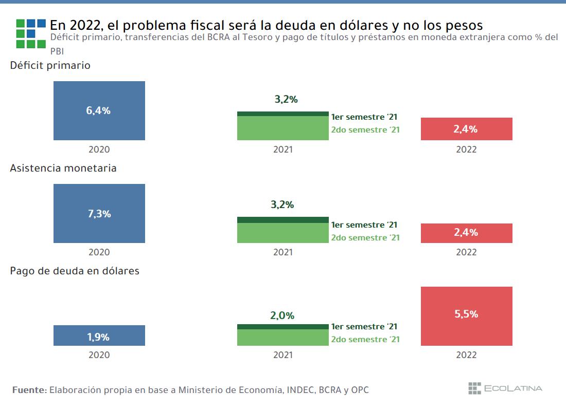Para 2022 estimamos que el gobierno intentará continuar reduciendo del déficit primario (en dos semanas conoceremos la trayectoria fiscal deseada con la presentación del Proyecto de Presupuesto), lo cual sería indicativo de la intención de evitar tensiones excesivas sobre los factores de creación de dinero por el lado fiscal. En cualquier caso, las preocupaciones comienzan a aparecer por los compromisos en moneda extranjera. Respecto a esos pagos, no hay duda: se requiere una extensión de vencimientos. ¿Será la mejoría fiscal un guiño al Fondo de cara a lo que se viene?