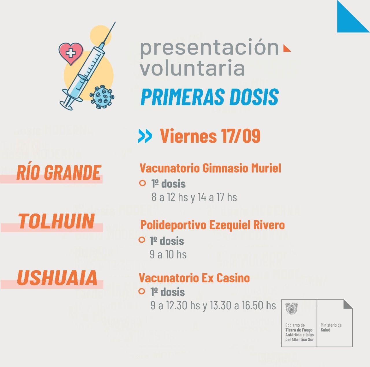 Ese día se realizará una jornada de aplicación de primeras dosis a demanda espontánea, simultáneamente en Ushuaia, Tolhuin y Río Grande; destinada a personas mayores de 18 años.