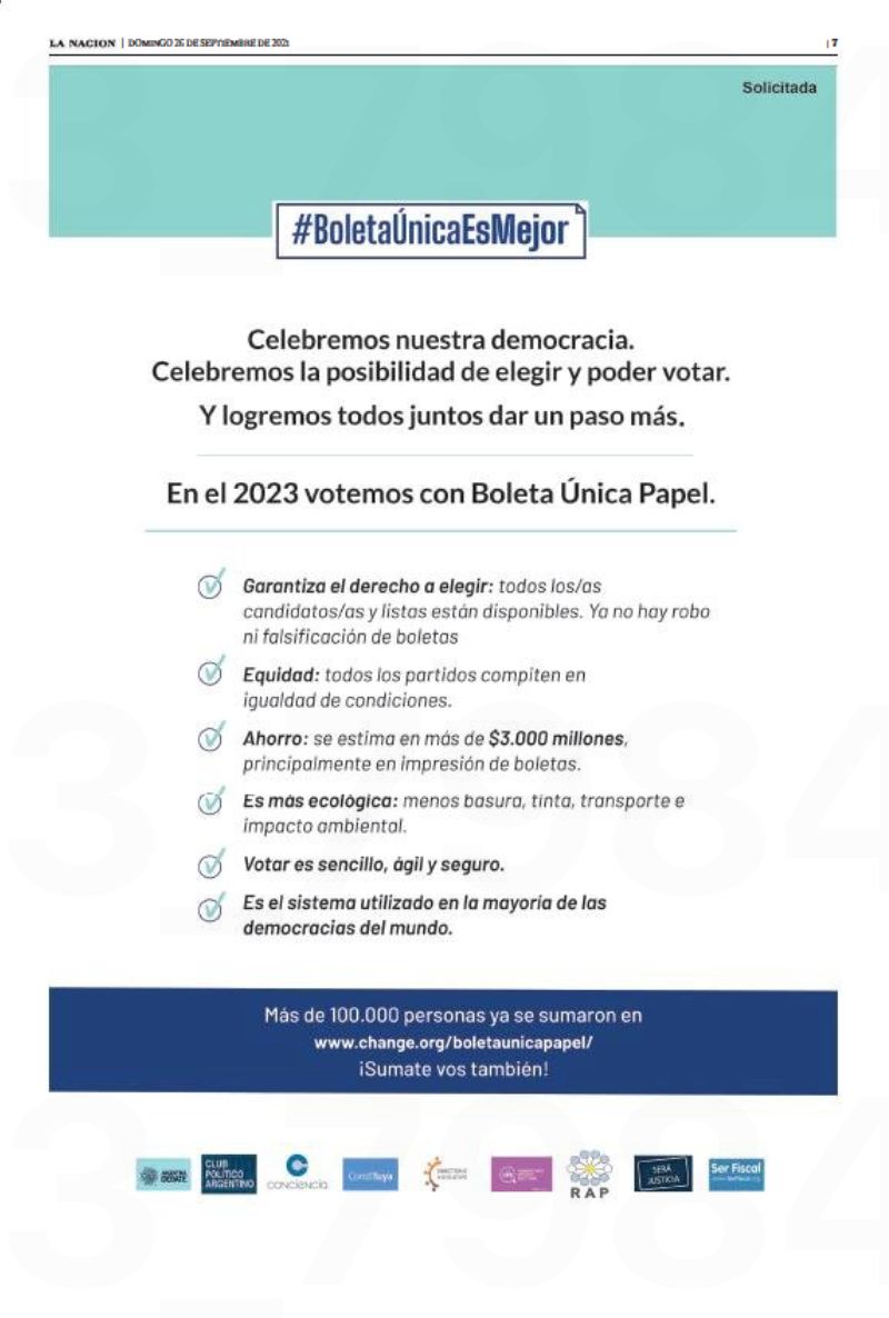 Desde el espacio que promueve la Boleta Única de Papel expresaron su “agradecimiento a los medios comprometidos que nos facilitan llegar a una gran audiencia: Clarín, La Nación, Cronista, Infobae, La Voz del Interior, La Gaceta de Tucumán, Los Andes de Mendoza, La Capital de Rosario, El Litoral de Santa Fe, Paralelo32 de Entre Ríos, El Libertador de Corrientes, El Ancasti de Catamarca, Diario Huarpe de San Juan, El Liberal de Santiago del Estero, Formosa, La Voz del Chaco, Río Negro, Tiempo Sur de Santa Cruz, El Diario del Fin del Mundo de Tierra del Fuego”.