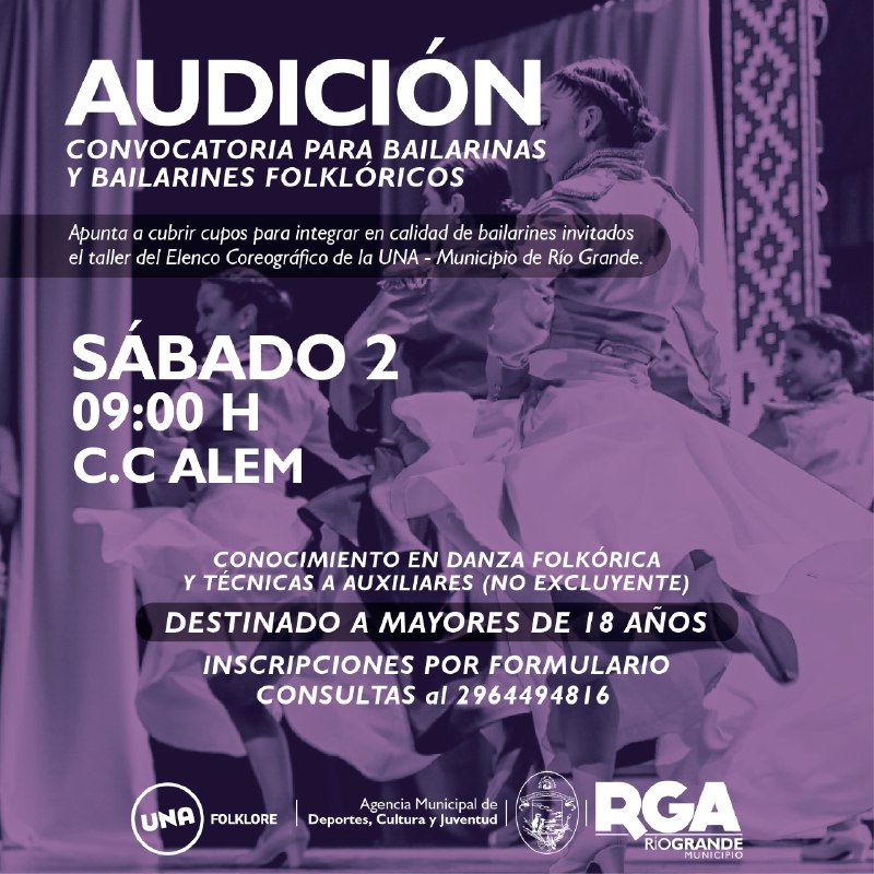 Rio Grande 30/09/2021.- La Subsecretaría de Cultura, dependiente de la Agencia Municipal de Deportes, Cultura y Juventud, convoca a bailarinas y bailarines folklóricos de la ciudad a una audición con el fin de cubrir cupos para integrar en calidad de bailarines invitados el taller del Elenco Coreográfico de la UNA (Universidad Nacional de las Artes) – Municipio de Río Grande, durante el próximo año.