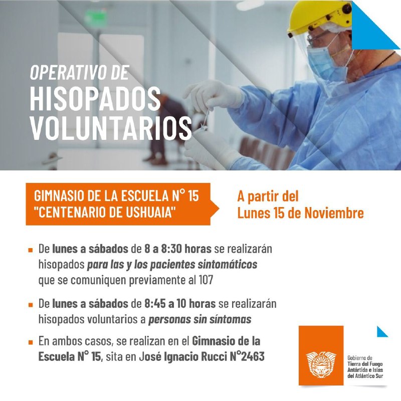 Mientras que, de lunes a sábados, de 8:45 a 10 horas se realizarán hisopados voluntarios a personas sin síntomas.