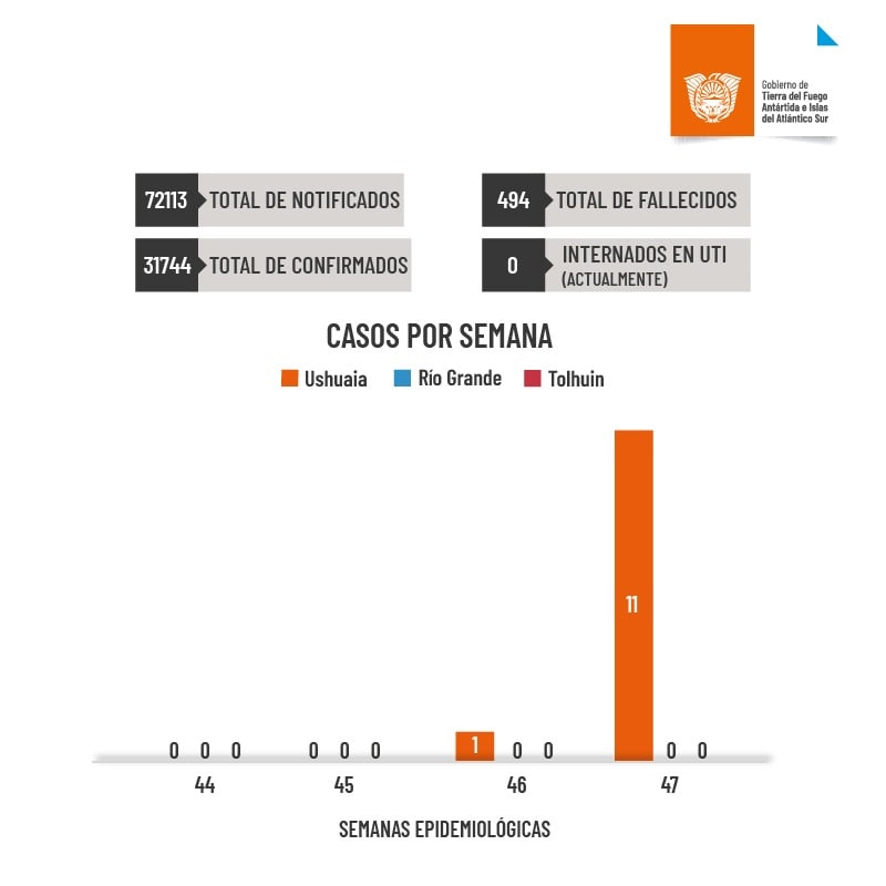 En la última semana se detectaron 11 nuevos casos en Ushuaia (la totalidad de los casos de la semana 47 corresponden a personas aisladas relacionadas a cruceros), ninguno en Río Grande y ninguno en Tolhuin. Actualmente no hay pacientes internados en UTI en toda la Provincia. El número de altas desde el inicio de la pandemia asciende a 31.237. Hay en el día de la fecha 13 casos activos en Tierra del Fuego.