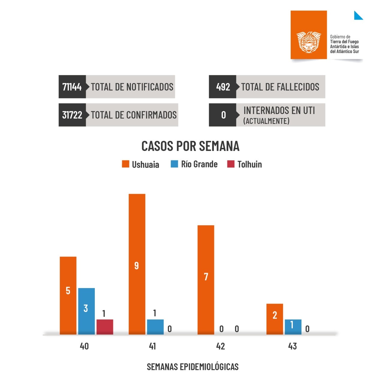 En la última semana se detectaron 2 casos nuevos en Ushuaia, uno en Río Grande y ninguno en Tolhuin. Actualmente no hay pacientes internados en UTI en toda la Provincia. El número de altas desde el inicio de la pandemia asciende a 31.236. Hay en el día de la fecha 3 casos activos en Tierra del Fuego.