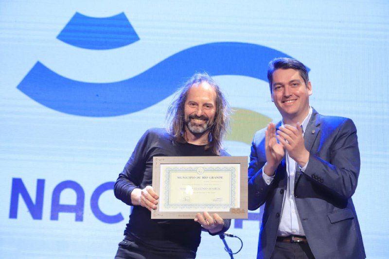 Rio Grande 21/11/2021.- Lo hizo como parte de los eventos relacionados a la puesta en marcha de un potente transmisor con alcance a Malvinas de Radio Nacional. El «Chango» fue distinguido por el Intendente como «Huésped de Honor de la ciudad de Río Grande».