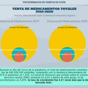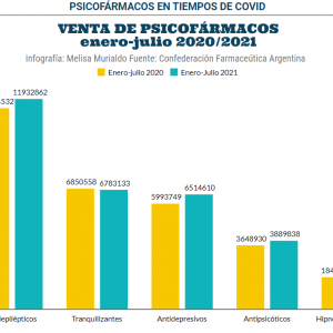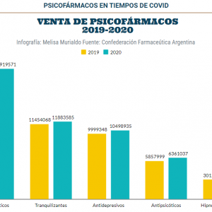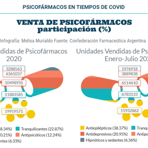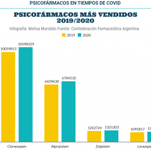 De acuerdo a la Confederación Farmacéutica Argentina (COFA), durante 2020 se vendieron 538.514 unidades más de clonazepam y 344.880 unidades más de alprazolam que en 2019. Cantidades que triplican y quintuplican el promedio general de unidades dispensadas de medicamentos, registrado el año del inicio de la pandemia.