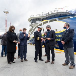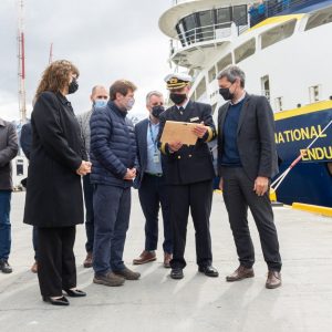 Luego el Gobernador Melella, el Ministro Lammens, la vicegobernadora Urquiza y autoridades provinciales se dirigieron al puerto para hacer entrega de una placa al capitán del Nat Geo Endurance, Oliver Kruess, por ser la primera embarcación que inicia la temporada 2021-2022.
