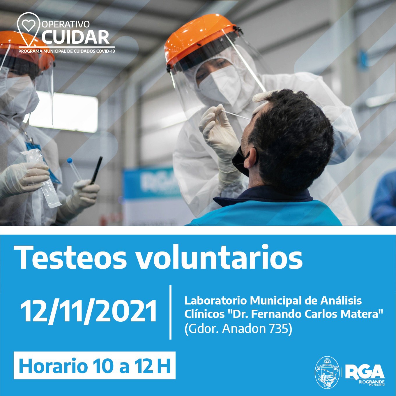Rio Grande 11/11/2021.- La Secretaría de Salud informa a los vecinos y vecinas que este viernes 12 de noviembre, en el horario de 10 a 12, se llevará adelante la jornada de testeos voluntarios de Covid-19 en el Laboratorio Municipal de Análisis Clínicos y Biología Molecular, ubicado en Anadón 735 (Chacra II).