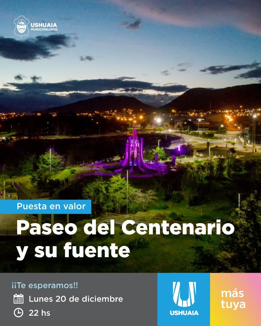 Habrá un show de luces y música LA MUNICIPALIDAD DE USHUAIA CONVOCA A CELEBRAR LA PUESTA EN VALOR DEL PASEO DEL CENTENARIO Y SU FUENTE