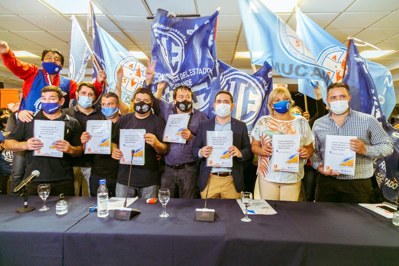 Rio Grande 23/12/2021. -El Gobierno de la Provincia de Tierra del Fuego AIAS firmó junto a los sindicatos de ATE, ATSA y UPCN el convenio colectivo de trabajo para los trabajadores y trabajadoras del Estado Provincial en su aspecto general. A partir de este acuerdo se continuará trabajando en los convenios particulares para cada sector.