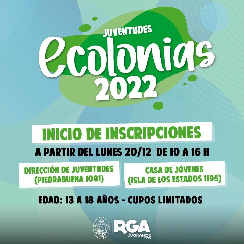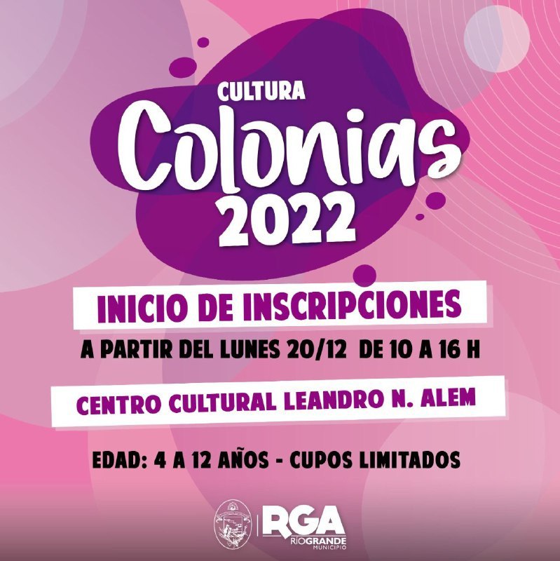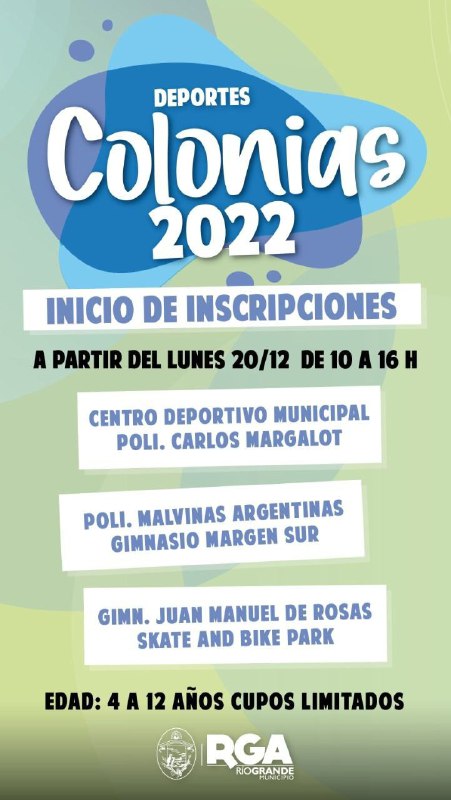 El Municipio de Río Grande informa a la comunidad que hoy lunes 20 de diciembre, comienzan las inscripciones para participar de las colonias deportivas, culturales, tecnológicas y de juventudes. Las mismas están destinadas a niños, niñas, jóvenes y adultos mayores de nuestra ciudad.