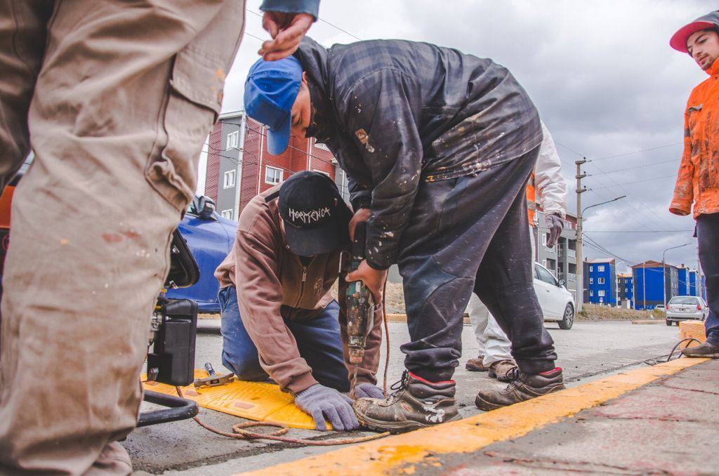 Ushuaia 30/12/2021.- La Municipalidad de Ushuaia, en un trabajo conjunto de la Subsecretaría de Servicios Públicos, la Coordinación de Señalamiento Vial y la Dirección de Tránsito, colocó dos reductores de velocidad en la avenida Hipólito Yrigoyen y su intersección con la calle Rompehielos Almirante Irizar.