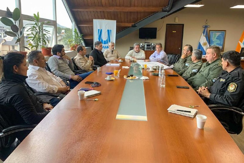 Ushuaia 21/12/2021.- El jefe de Gabinete de la Municipalidad de Ushuaia Omar Becerra, acompañado del secretario de Gobierno Pablo García con el subsecretario de Gobierno Gustavo Cinti y el subsecretario de Seguridad Urbana Alejandro Ledesma, mantuvo una reunión con representantes de Gendarmería, Prefectura Naval, Polícía Federal, Polícía provincial, la Dirección de Tránsito municipal y la Dirección de Transporte de la ciudad, para determinar acciones en conjunto reforzando las tareas de control y prevención en virtud del período de las fiestas de fin de año.