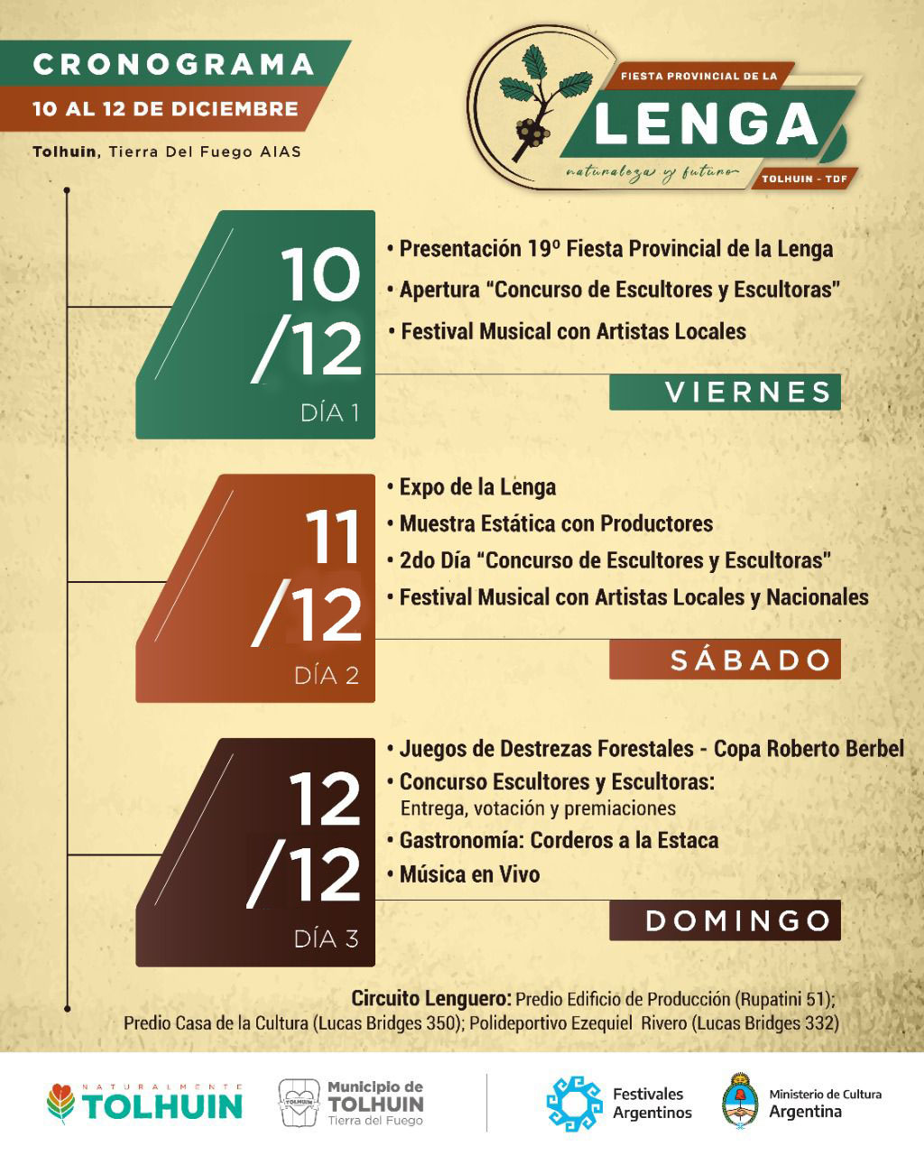 También habrá una nueva edición de la Expo de la Lenga “Creando en el Corazón” con artesanos, manualistas y artistas de Tolhuin; y una muestra estática de la mano de productores madereros.
