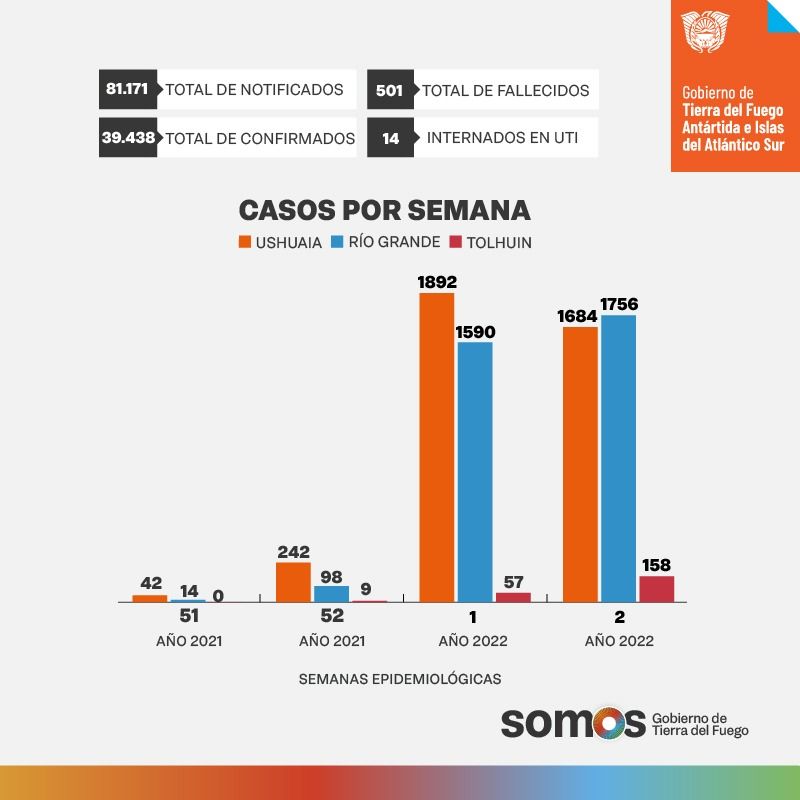 Ushuaia 17/01/2022.- El Ministerio de Salud de Tierra del Fuego AIAS actualizó el informe de situación en cuanto a la pandemia de Covid-19 en la provincia y su evolución en los últimos días, completando los datos correspondientes a la segunda semana epidemiológica de Enero.