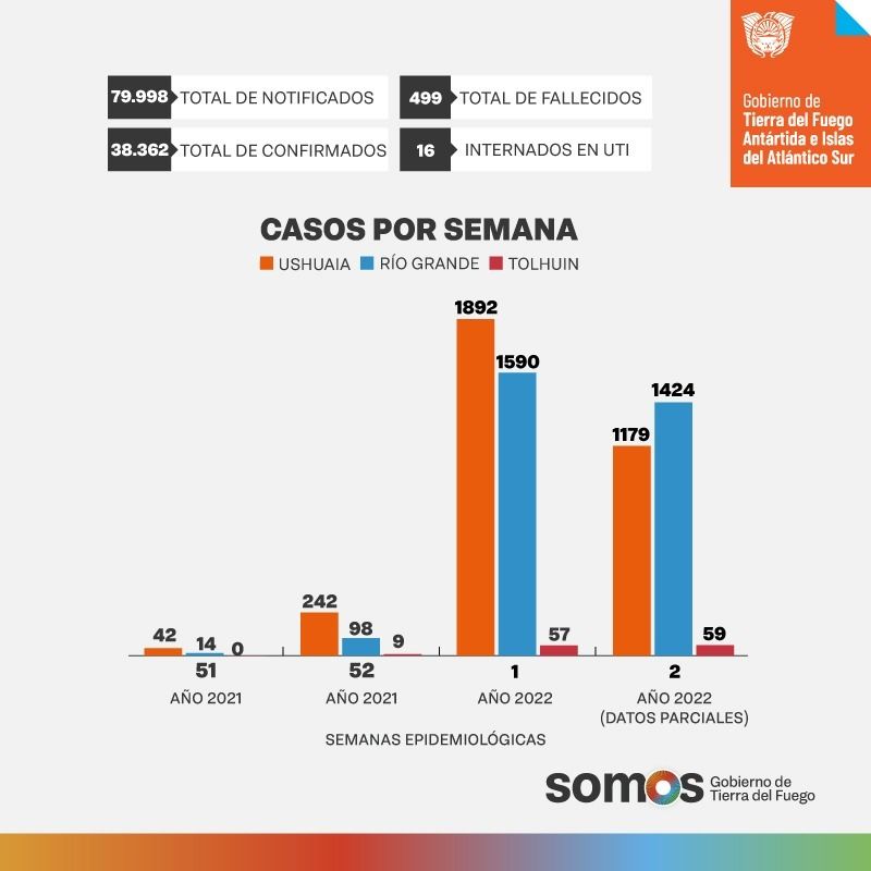 En cuanto a los resultados de las jornadas de hisopados que el Ministerio de Salud viene realizando en toda la provincia, en el período del 9 al 12 de enero, se detectaron 2660 nuevos casos: 1179 en Ushuaia, 1424 en Río Grande y 59 en Tolhuin. Al día de la fecha hay 4.012 casos activos en Tierra del Fuego. En cuanto a internación, en la actualidad hay 10 pacientes internados en Sala General y 4 en UTI en la ciudad de Ushuaia.
