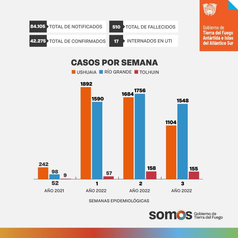 En cuanto a los resultados de las jornadas de hisopados que el Ministerio de Salud viene realizando en toda la provincia, del 16 al 22 de enero, se detectaron 2.807 nuevos casos: 1104 en Ushuaia, 1548 en Río Grande y 155 en Tolhuin. Al día de la fecha hay 4.642 casos activos en Tierra del Fuego.