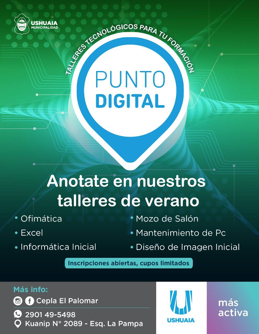 Los talleres abarcan contenidos de ofimática, informática inicial y mantenimiento de PC y diseño entre otros. Pablo Pérez, subsecretario de Desarrollo Comunitario, explicó que “son cursos intensivos pensados para sumar un conocimiento en esta época del año, que muchos lo usan para descansar, mientras que otras personas tienen la posibilidad de invertir este tiempo en capacitarse”. Dentro de las actividades de verano, el Punto Digital brindará talleres de formación tecnológica a lo largo del verano, tocando temáticas tales como servicios de salón, mantenimiento de PC y el uso de herramientas de oficina.