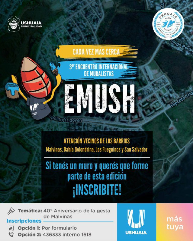 Con la tercer edición del EMUSH acercándose, se invita a vecinos de los barrios Malvinas, Bahía Golondrina, Los Fueguinos y San Salvador a participar de la actividad, otorgando para el uso de las y los muralistas paredes. Quienes estén interesados, podrán completar el formulario online: https://forms.gle/8pKbAHZLFno51t9j6 o comunicarse al 436-333 interno 1618 para más información.