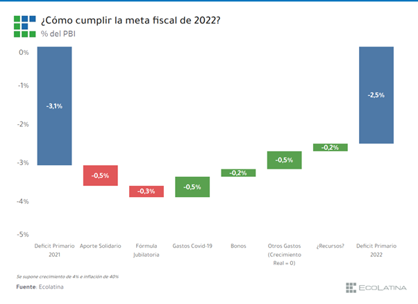 Asimismo, en 2021 el gasto primario contiene otros 0,2% del PIB en bonos a jubilados, pensionados y asignaciones, que no necesariamente deban otorgarse en 2022 debido al crecimiento real del índice de movilidad. Con estos dos elementos, el punto de partida de 2021 se ubica en 3,2% del PIB.