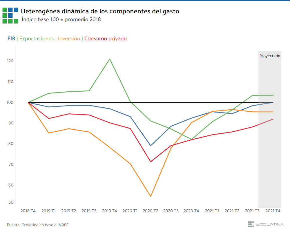 De cara a este año, y si bien tanto los salarios como las jubilaciones fueron de mayor a menor y tendrán un arrastre positivo en el arranque de 2022, muchos de estos factores no estarán, o perderán fuerza: la recuperación en la cantidad de ocupados no será la de 2021, el tipo de cambio no se atrasará y las tasas de interés tenderían a ubicarse en terreno positivo.