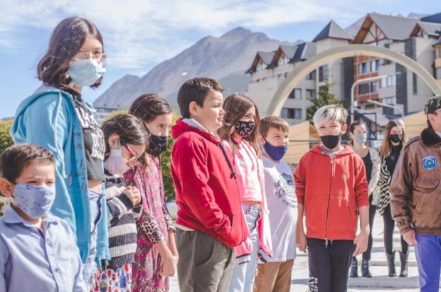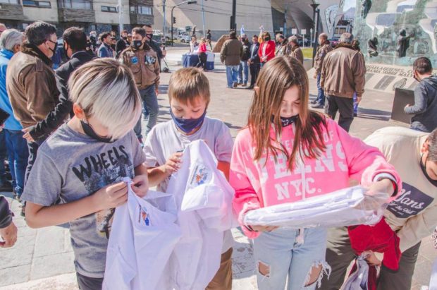 Ushuaia 24/02/2022.- La Municipalidad de Ushuaia participó del acto llevado a cabo en la Plaza Islas Malvinas, donde el gremio SATSAID hizo entrega de guardapolvos con el logo de las Islas Malvinas. Dicho símbolo es de uso obligatorio por la Ley Thiago, sancionada por la Legislatura Provincial.