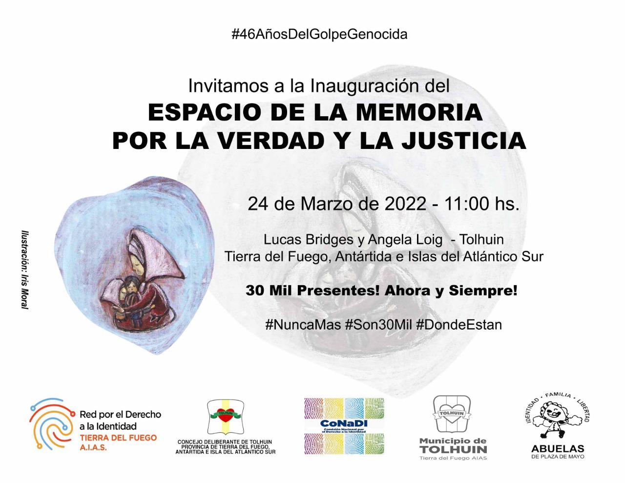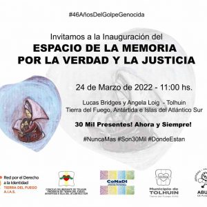 Tolhuín 23/03/2022.- Desde el Municipio de Tolhuin, invitamos a vecinos y vecinas a participar de la inauguración del nuevo Espacio de la Memoria, por la Verdad y la Justicia.