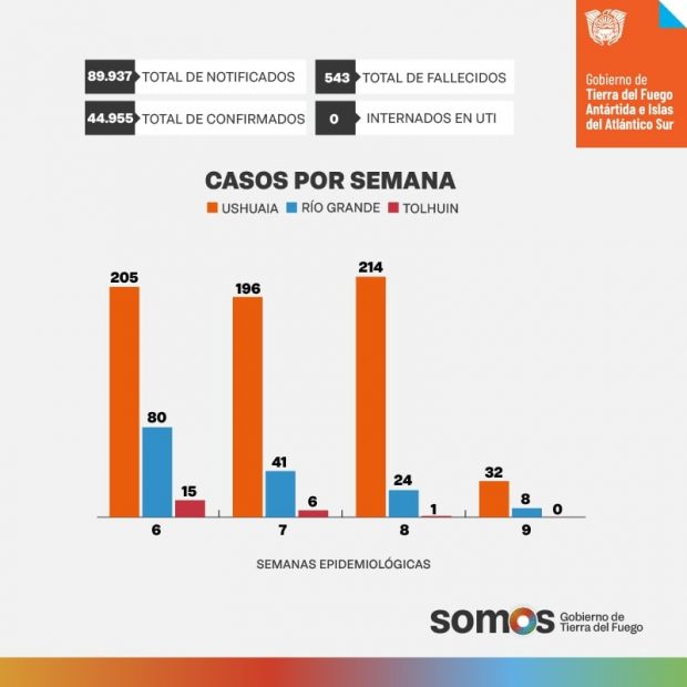 Ushuaia 07/03/2022.- El Ministerio de Salud de Tierra del Fuego AIAS actualizó el informe de situación en cuanto a la pandemia de Covid-19 en la provincia y su evolución correspondiente a la novena semana epidemiológica de 2022.